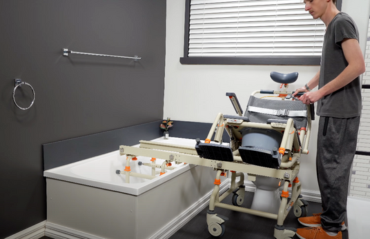 - Using the tilt release, the carer leans the user back so that the footrest clears the edge of the bathtub.