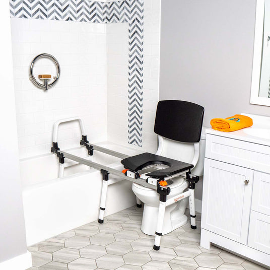 ShowerGlyde SG3 is a sliding transfer bench designed to fit in tighter environments or bathrooms with a vanity adjacent to the tub. Shorter rails and a swivel option aIlow the bench to clear the obstruction/tight space without sacrificing comfort or ease of use.